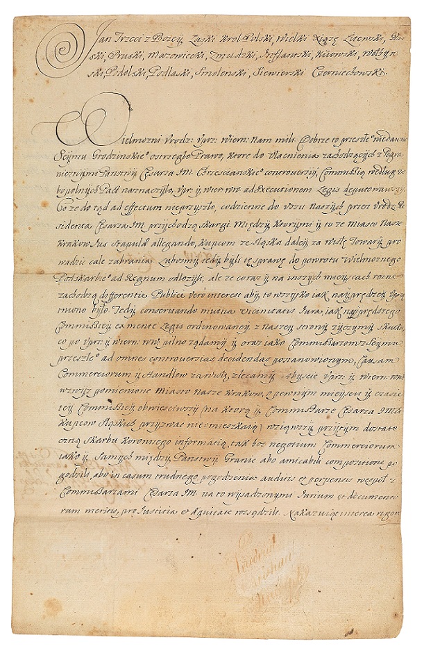 Mandat zur Umsetzung der Beschlüsse des unlängst in Schloss Grodno (Hrodne, Weißrussland) gehaltenen Sejm (polnische Nationalversammlung); betreffend Handelsverträge mit dem Reich und die Klagen des kaiserlichen Gesandten, wonach die Stadt Krakau unter Berufung auf das Lagerrecht der Kaufleute aus Schlesien den Warentransport über die Weichsel verwehrt; weiters mit detaillierten Anweisungen zur Neuordnung der Außenhandelsbeziehungen. Starting 500 euro. Dorotheum. 06/05/20