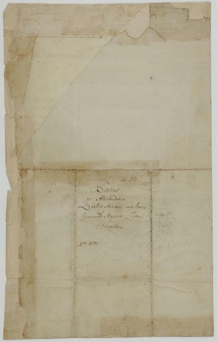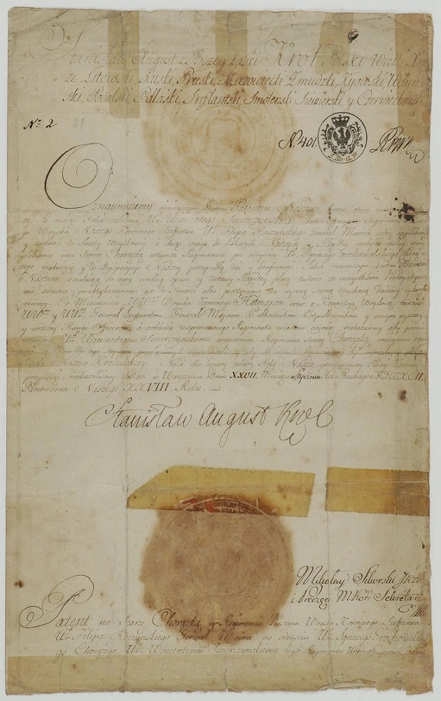 778. STANISLAW AUGUST PONIATOWSKI SIGNED DOC. On double sheet of laid paper in Polish, untranslated, being a multiple appointment of military officers dated 1792 with Imperial seal, large bold signature, paper with J. KOOL and coat of arms “Horn” watermark. Folds and old tape stains. An interesting document from the last king of Poland. 15 inches x 9.5 inches (38 x 24 cm). Estimate $250 – 500. Jackson’s Auction. 06/24/20. Sold $1,400 (hammer)