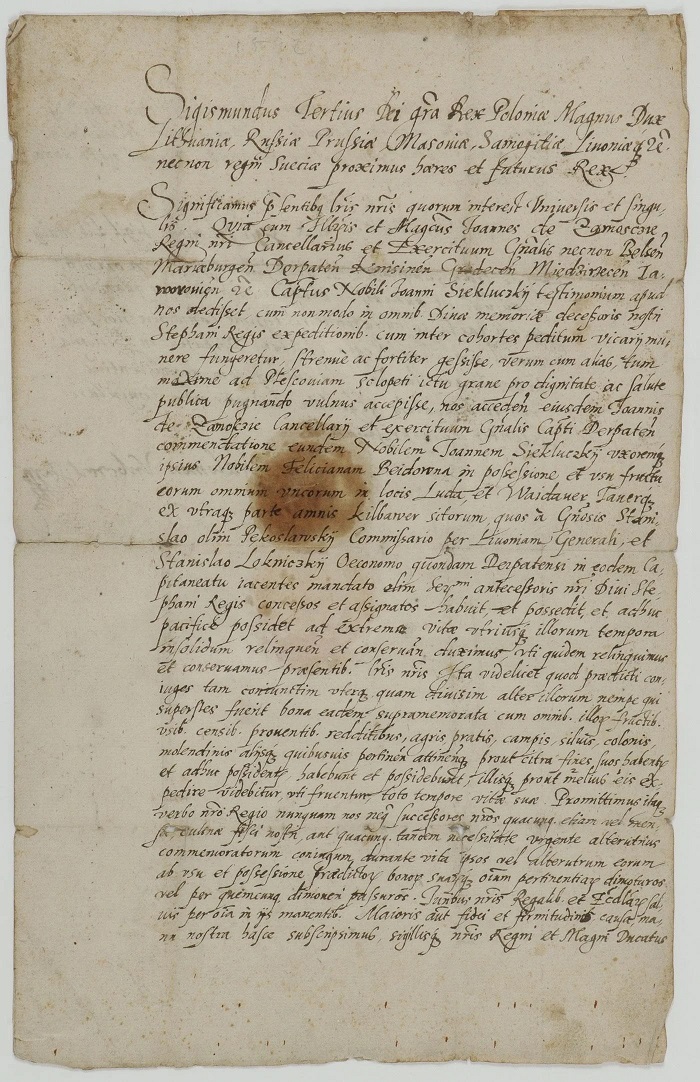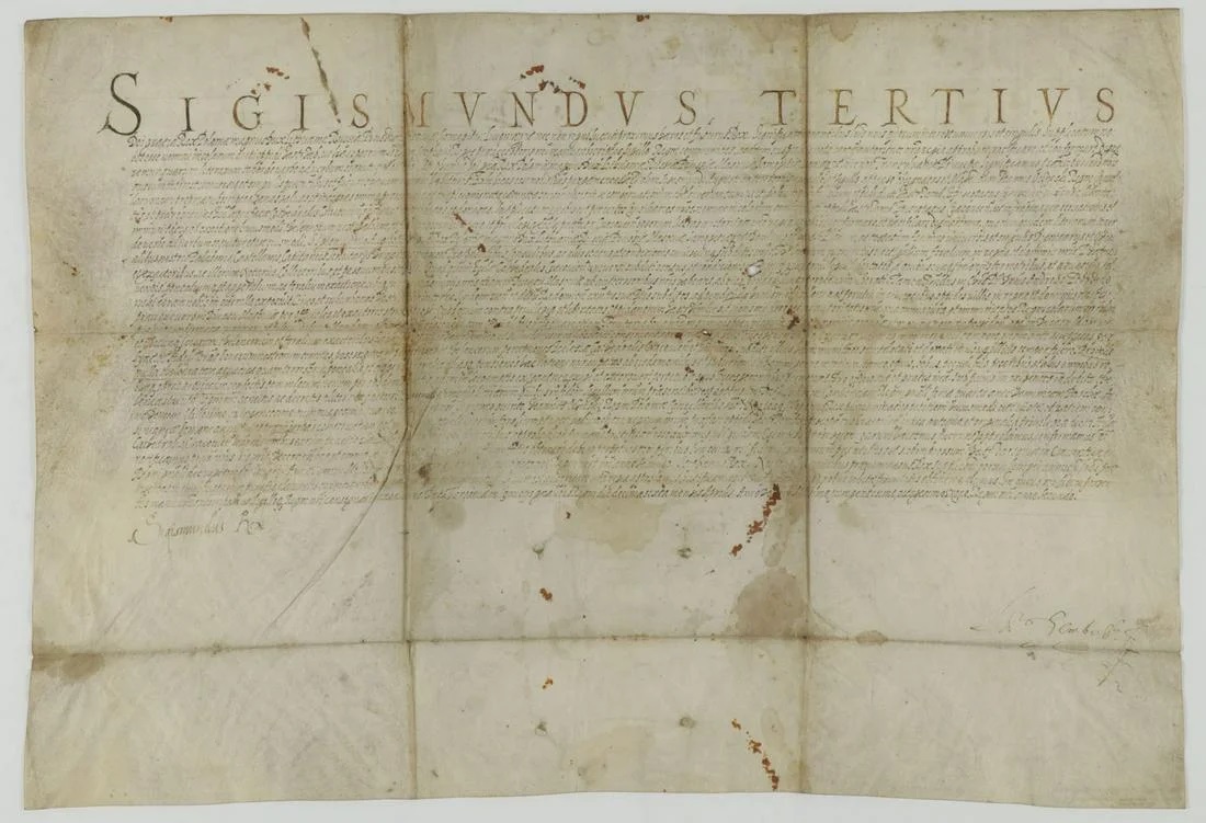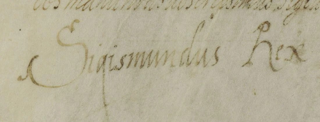 Lot 784. RARE KING SIGISMUND III VASA OF POLAND DOCUMENT. Comprising a large signed vellum document in Latin, the upper margin inscribed SIGISMUNDUS TERTIUS above a lengthy inscription, untranslated, dated 1589 (second year of his reign), signed at left Sigismundus Rex. 14.25 inches x 20.5 inches (36 x 52 cm). Scarce. Estimate $250 – 500. Jackson’s Auction. 06/24/20. Sold $1,800 (hammer)