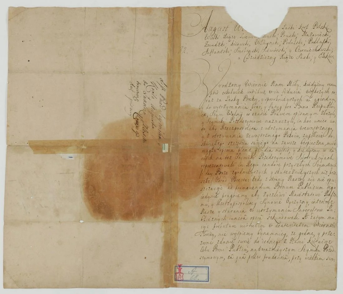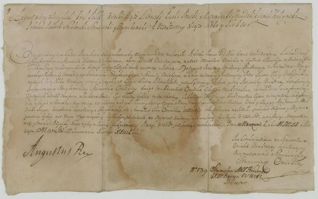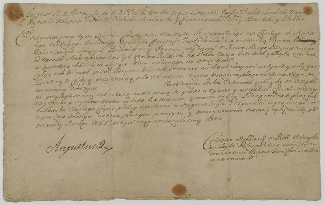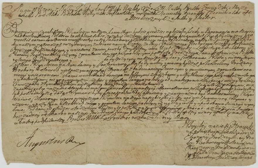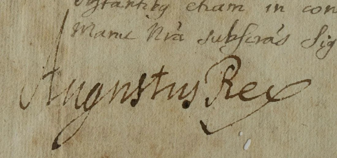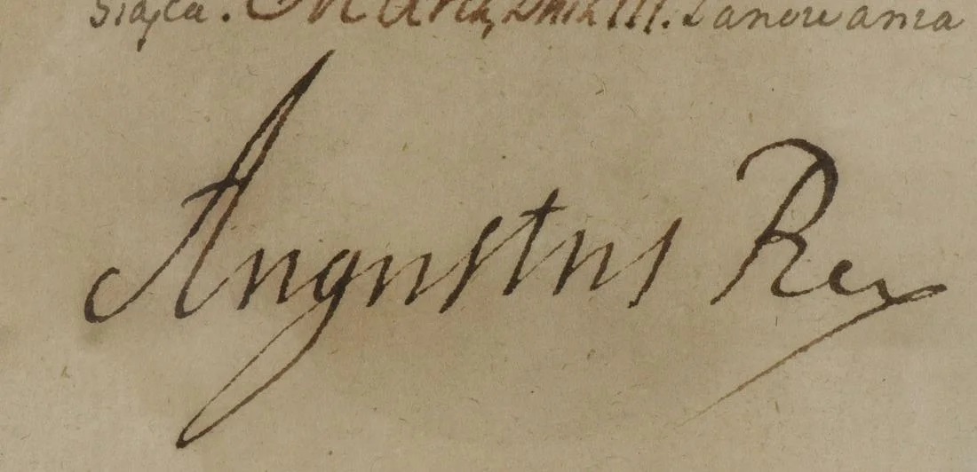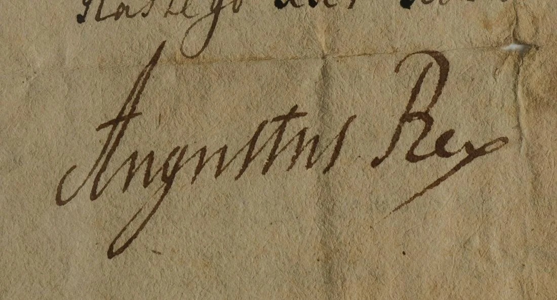 Lot 781. AUGUSTUS II KING OF POLAND SIGNED DOCUMENT. On double sheet of laid paper with coat of arms “Horn” watermark, in Polish, untranslated, boldly signed lower left Augustus Rex, 8 inches x 12.75 inches (20 x 32.5 cm). Provenance: The estate of Michael Albery (1893-1973). To his daughter Ursula Anna Smith née Albery (1922- 2018). Estimate $250- 500. Jackson’s Auction. 06/24/20. Sold $650 (hammer)