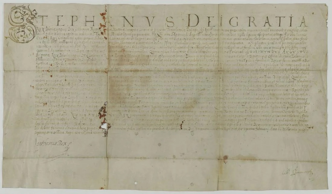 786. KING STEPHEN BATHORY OF POLAND SIGNED DOC. Comprising a large and impressive vellum signed document in Latin, the upper margin inscribed STEPHANUS DEI GRATIA above a lengthy inscription, untranslated, dated 1578, signed lower left Stephanus Rex. 12.25 inches x 21 inches (31 x 53.5 cm). Scarce. Estimate $250 – 500. Jackson’s Auction. 06/24/20. Sold $$5,000 (hammer)