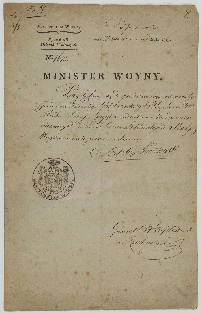 Lot 787. JOZEF PONIATOWSKI SIGNED DOCUMENT. Dated May 8, 1813, the partially printed and hand inscribed double sheet document, in Polish, untranslated, on laid paper. Writing as Minister of War and being a release from military service granted to a Captain Gotebiowski, boldly signed by Jozef Poniatowski and with Minister of War seal. 12.25 inches x 7.5 inches (32 x 19 cm). Estimate $200 – 300. Jackon’s Auction. 06/24/20. Sold $2,200 (hammer)