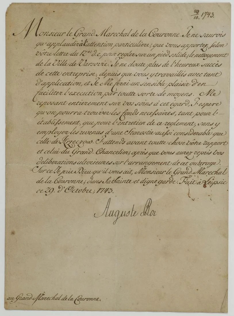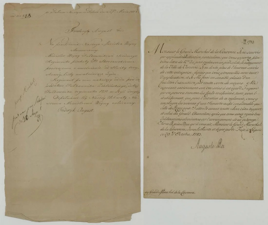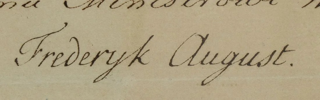 Lot 788. AUGUSTE III KING OF POLAND LETTER & MORE. Comprising a double folded sheet of laid paper dated October 29, 1743, written in French to Grand Marechal De La Couronne, boldly signed Auguste Roi. 10.25 inches x 7.25 inches (26 x 19 cm). Together with an 1808 dated single sheet letter in Polish, untranslated, apparently requesting the release from military duties of a Colonel Zielinski and signed Frederyk August for Frederick Augustus I of Saxony (1750-1827), 13.25 inches x 8.5 inches (33.5 x 21 cm). Estimate $150 – 200. Jackson’s Auction. 06/24/20. Sold $900 (hammer)