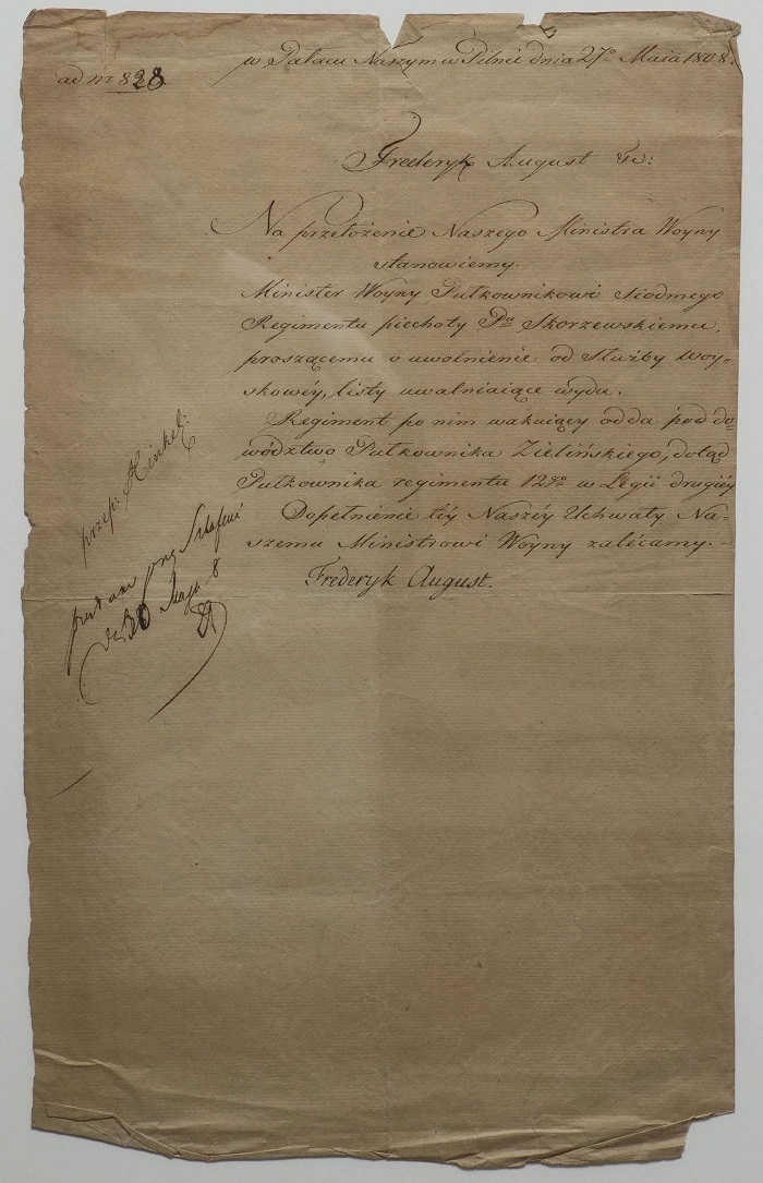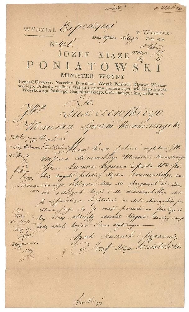 Lot 378. Manuscript DS, in Polish, one page, 8 x 12, February 19, 1810. Letter to Minister of the Interior Jan Pawel Luszczewski, written in favor of Captain Kurosz, who had served valiantly in the infantry of the Polish army of the Warsaw Duchy, but whose forces were failing after his wounds and who solicited a place in the administration of the forests. In fine condition. Estimate $1,000 – 1,500. RR Auctions. 06/10/20