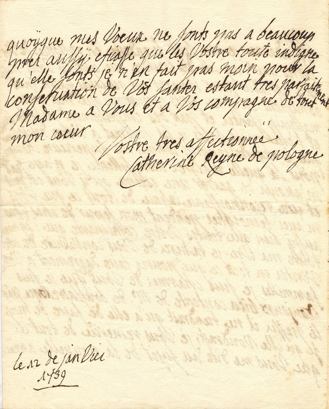 Lot 692. OPALINSKA CATHERINE: (1680-1747) Queen consort of Poland and Grand Duchess Consort of Lithuania 1705-08 & 1733-36 as spouse of Stanislaw I of Poland. She lived in exile in Sweden and France since 1708. In 1725, her daughter Marie was chosen to be the Queen of France, which made Catherine mother-in-law to King Louis XV of France. After the wedding, Catherine and Stanislaw resided at the Chateau de Chambord. An excellent A.L.S., `Catherine Reyne de Pologne´, (`Catherine, Queen of Poland´), two pages, 4to, n.p. [France], 12th January 1739, to an unidentified lady, in French. The Queen apologizes for her late reply, only due to her bad health and unexpected bad events, and states in part `..despite my silence, I am keeping a deep esteem which I owe to you and an infinite recognition for all you have given testimony to me during my stay with you as well as with all your people who I will always love…´ In very fine condition. Estimate 600 – 900 euro. International Autograph Auction Europe. 07/23/20
