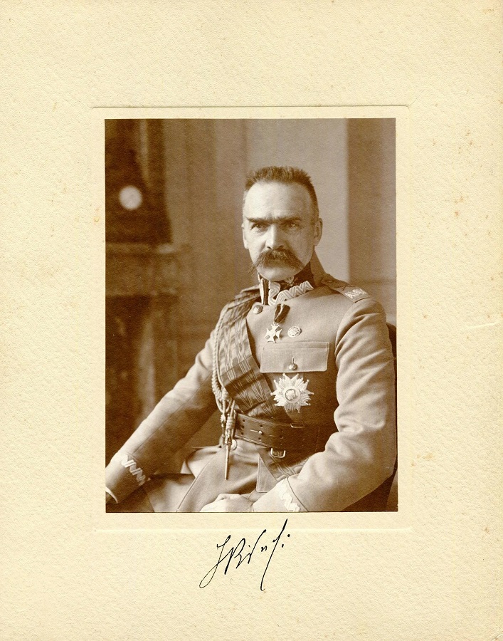 Lot 768. PILSUDSKI JOZEF: (1867-1935) Polish Statesman. First Marshal of Poland and Chief of State 1918-22. Pilsudski is widely considered the De Facto leader of the Polish Republic 1926-35 as minister of Military Affairs, and the father the Second Republic. Pilsudski remains regarded today as a respected Polish Patriot, and the Founder of the modern independent Poland. Extremely rare signed 8 x 10 photograph, `J.Pisuldski´, in Polish, the impressive image depicting the Marshal of Poland seated, wearing his military uniform and decorations, in a half length pose. Signed in bold black fountain pen ink at the base and to the matted border. A rare and desirable in any form signed photograph. Very small minor toning and staining to the matted edges only, and remnants of former affixing to the verso, otherwise VG. Estimate €2,000 – €3,000. International Autograph Auction Europe. 07/23/20
