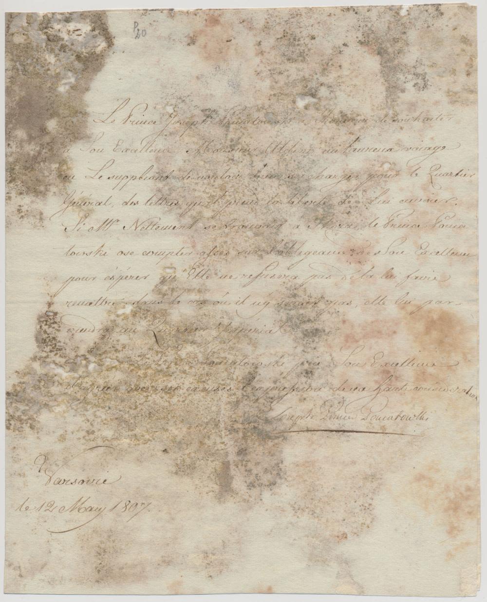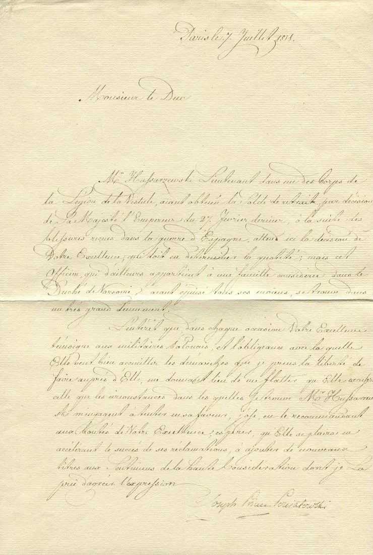 Lot 863. PONIATOWSKI JOZEF: (1763-1813) Polish General, Minister of War and Army Chief. Marshal of the Empire. An excellent L.S., `Joseph Prince Poniatowski´, one page, folio, Paris, 7th July 1811, to the Minister of War Duke de Feltre, in French. Poniatowski, in his capacity as General of division and Chief Commander of the Polish army, tries to help some compatriots during his stay in Paris, stating in part `Monsieur Hussarzewski, Lieutenant serving in the Vistula Corps, having obtained last 2nd of February the retreat as a result of his wounds in the war of Spain and after decision of His Majesty the Emperor, is waiting here for your Excellency decision about the quality of the retreat; but this officer, belonging to a very important family from the Duchy of Warsaw, has spent all his money and is out of any income…´ further saying `Knowing that Your Excellency has always shown testimony of his kindness towards Polish military officers…´. A cleanly written letter in very fine condition. Folded. VG At the time of the present letter, Poniatowski was in Paris invited to attend the festivities on the occasion of the birth of Bonaparte´s son, Prince Imperial and King of Rome Napoleon II, born on 20th March 1811. During his stay Poniatowski had a love affair with Pauline Bonaparte, younger sister of Napoleon, an affair which became the gossip in Paris. Poniatowski tried to leave Paris immediately after the celebrations but Napoleon kept him in Paris until the 15th of August for his birthday. Curiously the letter sheet bears an English watermark ”Skeats – 1808”, considering that Napoleon had ordered a Continental Blockade since 21st November 1806. Estimate €2,500 – €3,500. International Autograph Auction Europe. 07/23/20