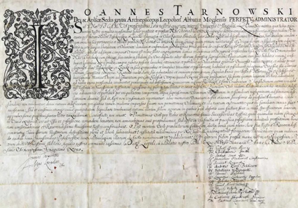 Lot 99. Tarnowski, Johannes (Jan). Erzbischof von Lemberg (Lwow). Urkunde mit eh. Unterschrift. Lateinische Handschrift auf Pergament, Mit großer kalligraph. Initiale, dat. Lemberg, 6. Januar 1669. Qu.Gr.Fol. Mit den zusätzl. Unterschriften des Priors und der Mönche, ohne die siegel. Mehrf. gefalt. – Vertrag von Thomas Wierzbicki mit der Abbatiae Mogilensis. – Tls. etw. gebräunt. Estimate 240 euro. Antiquariat Peter Kiefer. 07/02/20