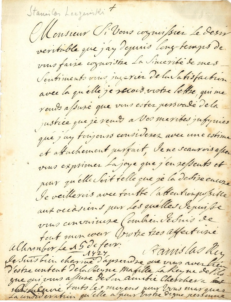 Lot 975. STANISLAS LESZCZYNSKI (1677-1766) Roi de Pologne, beau-père de Louis XV, souverain des duchés de Bar et de Lorraine L.A.S. «Stanislas Rex», Chambord 15 février 1727, [au cardinal de FLEURY] ; 1 page in-4. Le père de la Reine dit «le desir veritable» qu’il a depuis longtemps de connaître le cardinal et la satisfaction qu’il a éprouvée à recevoir sa lettre, «qui me rend assuré que vous estes persuadé de la justice que je rends a Vos mrites infynies que j’ay toujours considerez avec une estime et attachement parfait». Il veillera à ne point manquer toute occasion de lui exprimer ses sentiments… Il ajoute : «Je suis bien charmé d’apprendre que vous avez lieu d’estre content de la Reyne ma fille. La Reyne de Pologne qui vous assure de son amitié cherchera a l’envie touts les moyens pour Vous marquer la consideration qu’elle a pour Vostre digne personne». Estimate 1 000 – 1 500 €. Aguttes. 11/17/20