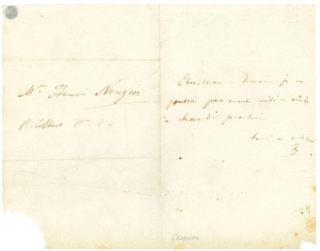Very rare letter to George Sand, one of the few letters from Chopin that was not burnt by George Sand.