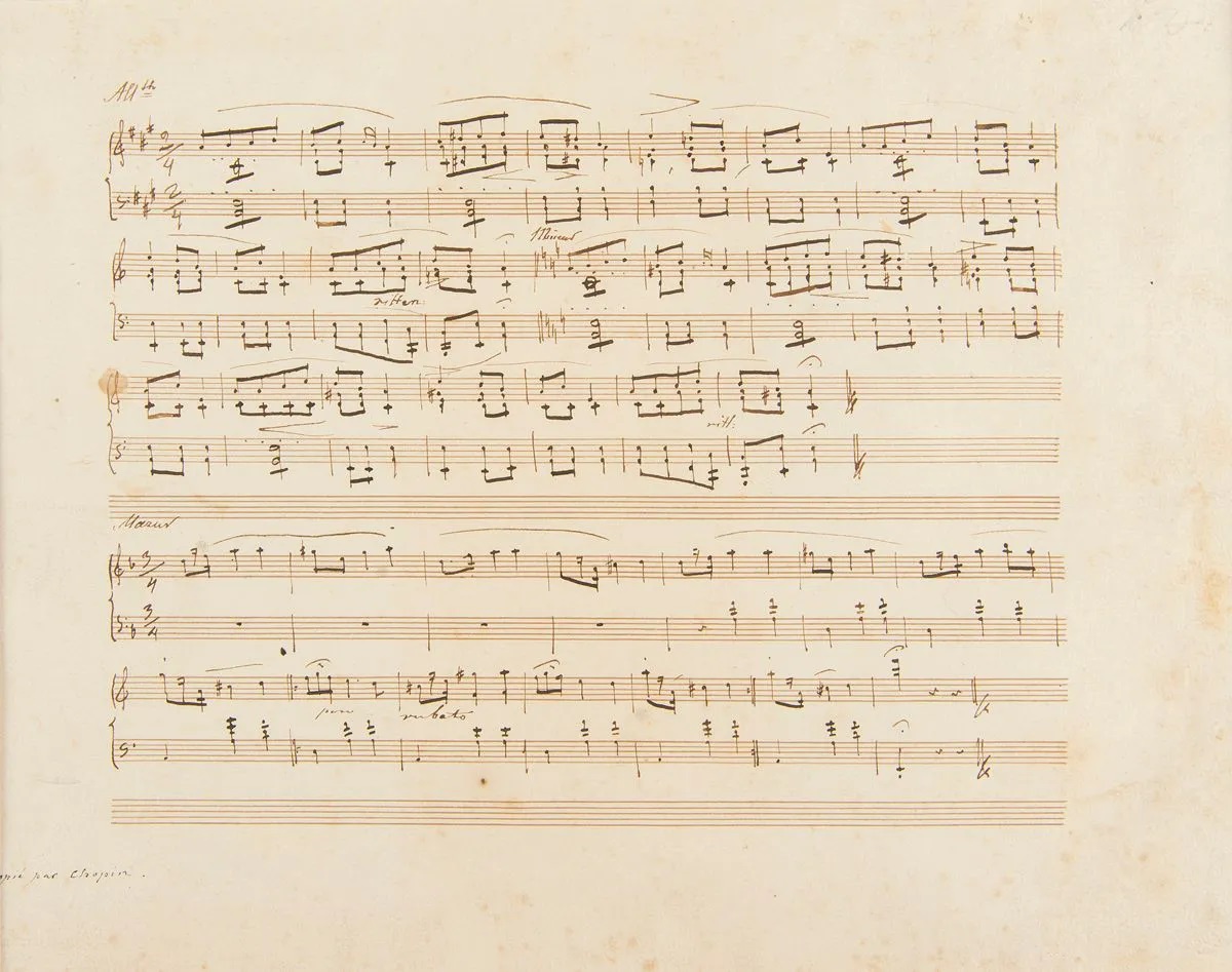 MANUSCRIT MUSICAL autograph signed “Ch”, Allegretto and Mazur [KK VIIb 7-8], [ca. 1832-1833]; 1 page oblong in-fol. of heavyweight laid paper (22.8 x 28.7 cm), in a red morocco folder, slipcase. Two short works for piano, inspired by Polish folk music, which in turn inspired Franz Liszt.