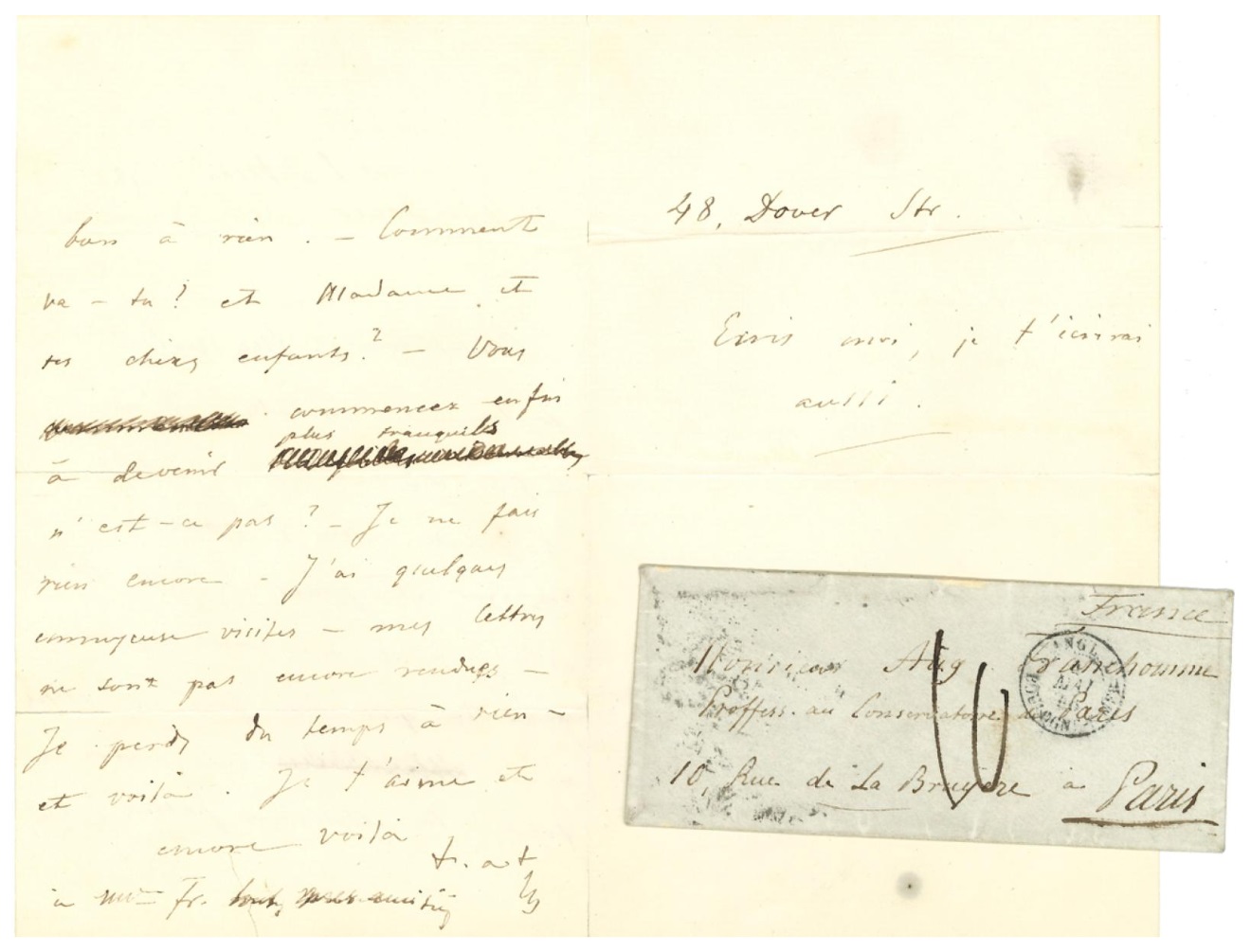 L.A.S. “Ch”, [London] May 1, 1848, to Auguste FRANCHOMME, “Professor at the Conservatoire” in Paris; 2 1/2 pages in-8 with some erasures, envelope with postmarks. On his arrival in London. [Chopin announces to his close friend, the cellist Auguste Franchomme (1808-1884), his arrival in London, for his last tour, while Paris is troubled by the aftermath of the February revolution; he will die the following year, and is already suffering from tuberculosis, which will take him away]. ” Chérissime, Me voilà seulement installé. I finally have a room – beautiful and large – where I can breathe and play – and the sun is coming to see me today for the first time. I’m less suffocating this morning but all last week I was good for nothing. – How are you? How are you and your dear children? – You’re starting to get quieter, aren’t you? – I’m not doing anything yet. I have some boring visits – my letters haven’t come in yet. – I’m wasting time on nothing – and that’s it. “I love you”… He gives his address: “48, Dover Str.” Estimate 30,000 – 35,000 euro. Ader. 11/20/20
