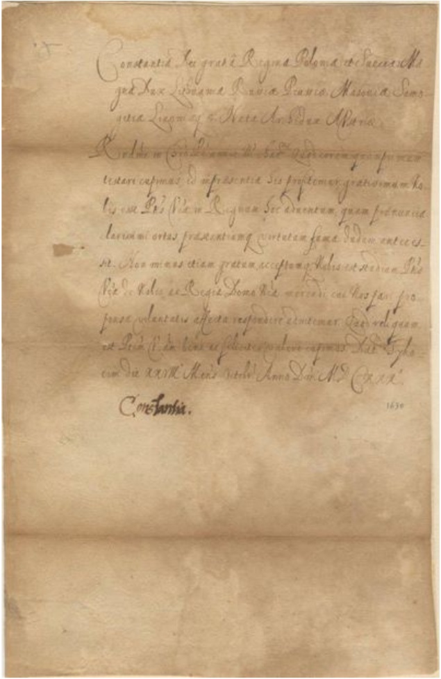 Lot 805. CONSTANCE OF AUSTRIA: (1588-1631) Queen of Poland 1605-31. Second spouse of King Sigismund III Vasa and mother of King John II Casimir. Very rare L.S., `Constantia´, a bold black ink signature, one page, folio, Tykocin (small town north-east of Poland), 28th October 1630, to Archbishop Larissano, Apostolic Nuncio to Poland, in Latin. To the heading, Constance is referred to as Queen of Poland, Sweden, Grand Duchess of Lusatia, Rusia, Prusia, Masovia, Samogitia and Livonia, `Born Grand Duchess of Austria´. The Queen welcomes the new appointed nuncio to Warsaw, stating in part `..To what an extent your very clean origin and the excellent fame of your qualities precedes you.. We welcome you and your philosophy in this our Royal House.´ Queen Constance died of a stroke few months after the present letter was signed, at the early age of 42. With address leaf, letter from the `Regina´, bearing a royal paper seal affixed. Overall foxing, the text remaining fully legible, otherwise G. Estimate 2,000 – 3,000 euro. International Auctions. 12/03/20