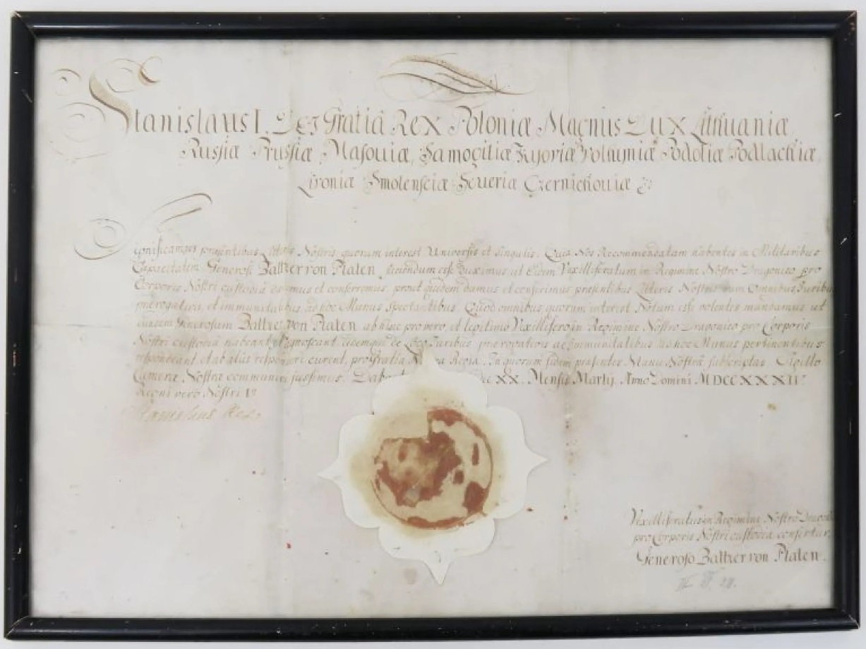 Lot 574.STANISLAS I (roi de Pologne). Pièce manuscrite signée “Stanislaus Rex”, Dantzig (“Gedani”), 20 mars 1734 (45 x 33 cm) en latin, sur vélin, avec restes de cachet de cire aux armes protégés par une pièce de papier découpée en quadrilobe : reconnaissance des capacités militaires de Baltzer von Platen, porte-étendard au régiment de dragons. Estimate 2 500 – 3 000 €. Boisseau-Pomez. 12/04/20