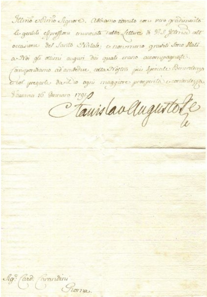 Lot 809. STANISLAW II: (1732-1798) Stanislaw August Poniatowski. Last King of Poland and Grand Duke of Lithuania 1764-95. Lover of Catherine the Great, he was a great patron of the arts, but still remains a controversial figure in Polish history. A good L.S., `Stanislau Augusto Rex´, a bold and large good signature example, one page, 4to, Warsaw, 26th January 1791, to Cardinal Carandini, in Rome, in Italian. Stanislaw II refers to the greeting letter received from his correspondent, stating `Illustrious and reverend Signore, We have received with true pleasure the kind expressions you send us on your letter.. on the occasion of the Saint Christmas, and not less grateful for the wishes you forward.. We wish to correspond with our most special benevolence..´ With blank integral leaf bearing an attractive watermark. Extremely small overall minor age wear, otherwise VG. Estimate 2,500 – 3,500 euro. International Autographs. 12/03/20