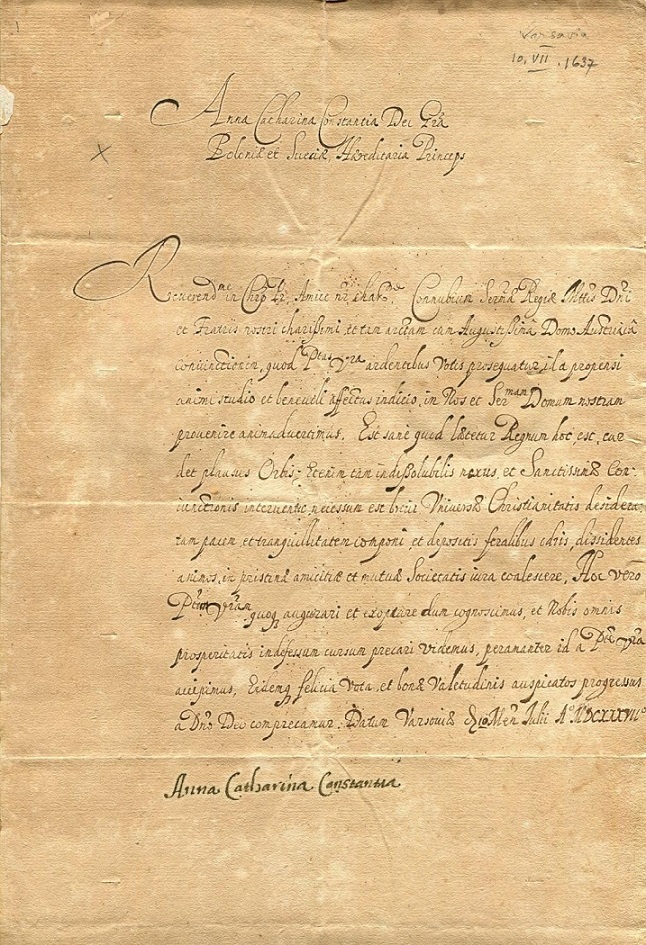 lot 757. VASA ANNA CATHERINE CONSTANCE: (1619-1651) Polish Princess. Rare L.S., `Anna Catharina Constantia´, one page, 4to, Warsaw, 10th July 1637, to Apostolic Nuntio and Archbishop of Larissa Visconti, in Latin. Constance, in her capacity as Crown Princess of Poland and Sweden thanks her correspondent for his letter and Good wishes and referring to the recent wedding of her brother the King of Poland Wladyslaw IV, states in part `The wedding of the Serene and Illustrious Queen and our very dear brother, a so wise marriage with the august Austrian Royal House ´ Further referring to the meaning of this wedding for the Polish and saying `It is reasonable what makes the Kingdom happy, to worry about minions, and for this reason this holy wedding was necessary at this time..´, further again stating `Universal Christianity desires so much peace and tranquility, putting together the dissenting spirits of the presentiment in pristine friendship and mutual society, and uniting in growing in justice.´ Constance died childless at the early age of 32. With address leaf, bearing a paper seal affixed. Small overall age wear, otherwise G Wladyslaw IV Vasa (1595-1648) King of Poland 1632-48, married Cecilia Renata of Austria (1611-1644) daughter of Holy Roman Emperor Ferdinand II. Cecilia Renata died at the very early age of 32 after the childbirth of her stillborn daughter. Cecilia Renata was chosen as bride by the Polish nobility. She married Wladyslaw on 9th August 1637 in Vienna by proxy, and then in Warsaw in person on 12th September 1637, and the same day was crowned at St. John´s Cathedral. This was the first royal coronation outside of Krakow, the historic, former capital of Poland. This greatly angered the Polish nobility. A law was instigated the year after to reserve coronations to Krakow. International Autograph Auctions Europe S.L. 07/16/21