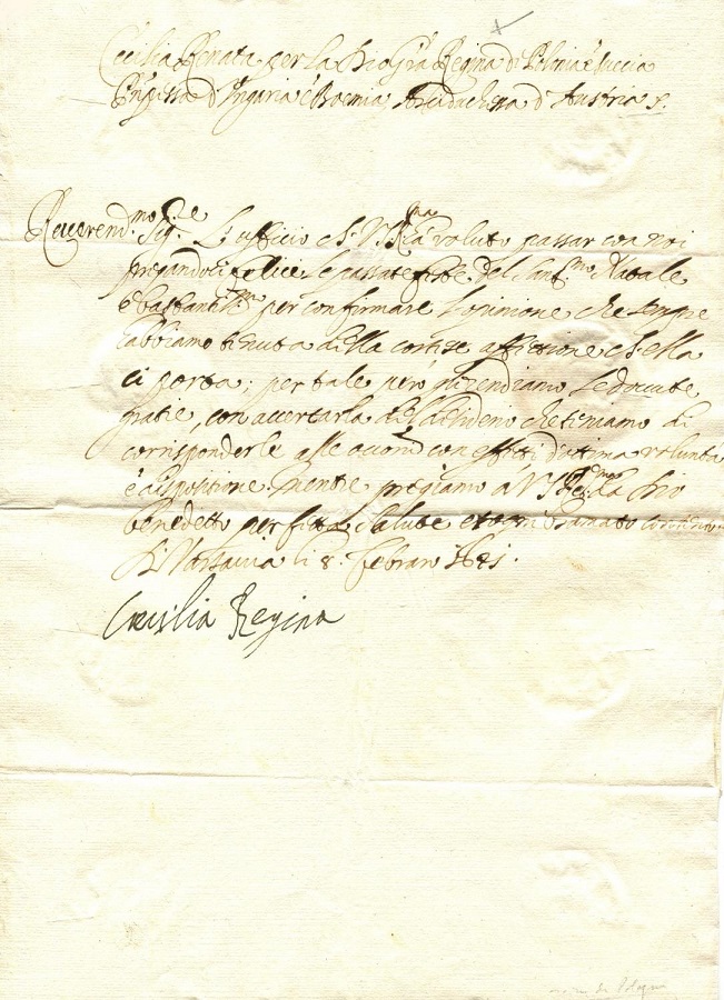 Lot 759. CECILIA QUEEN OF POLAND: (1611-1644) Cecilia Renata of Austria. Queen consort of Poland 1637-44 as spouse of King Wladyslaw IV Vasa. An extremely rare L.S., `Cecilia Regina´, one page, folio, Warsaw, 8th February 1641, to Reverend Monsignor Visconti, Bishop of Larissa, in Italian. The letter states to the heading `Cecilia Renata, by the Grace of God, Queen of Poland and Sweden, Princes of Hungary and Bohemia and Archduchess of Austria´, the Queen thanks her correspondent for the letter received and for the new year´s greetings and sends her best wishes. With address leaf bearing a Royal paper seal affixed. Very small overall creasing. International Autograph Auctions Europe S.L. 07/16/21