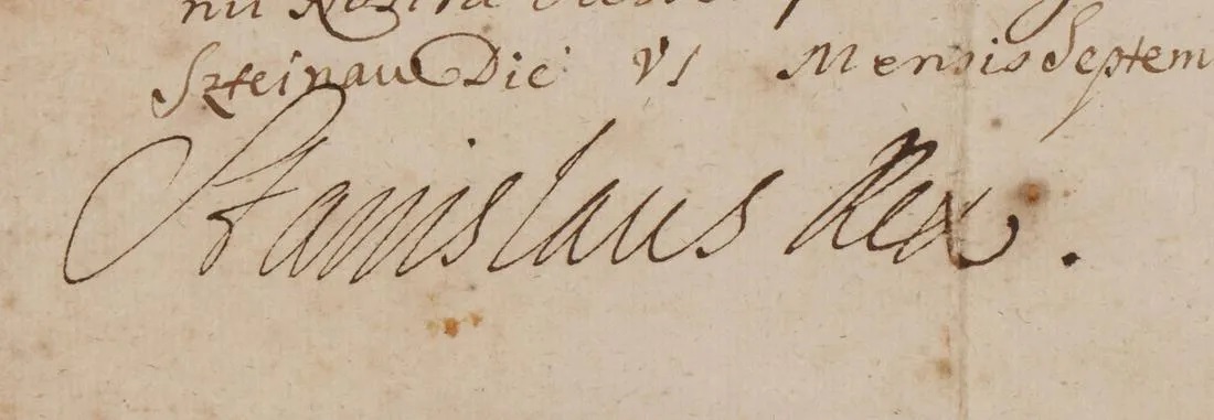 Lot 228. RARE POLISH DOCUMENT STANISLAW LESZCZYNSKI. On double sheet of laid paper with royal seal: coat of arms of Poland and Lithuania with Leszcynski “Wieniwawa” coat at center, dated September 6, 1707, inscribed in Polish, untranslated, boldly signed “Stanislaus Rex.” lower left, 8 inches x 12.8 inches (20.5 x 32.5 cm). Estimate $300 – 400. Jackson’s. 07/13/21