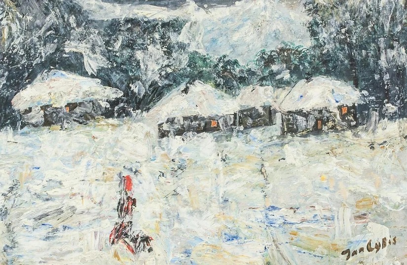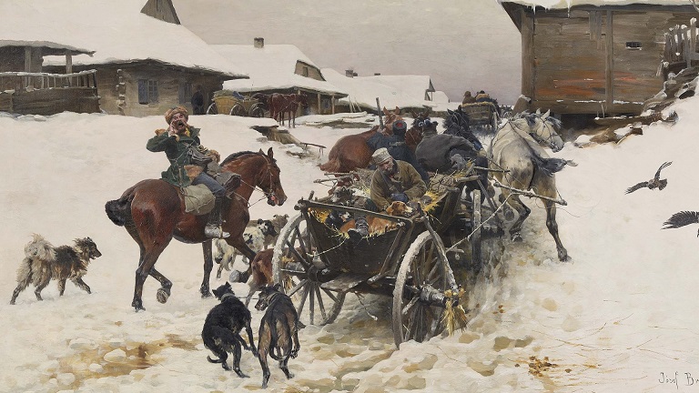 Lot 1190. After Jozef Brandt Snowy Winter Scene Painting. Horse drawn wagon approaches town. Signed, Warsaw. Polish language info on reverse. On canvas– Dimensions: Image Size: H: 21 inches: W: 31 inches. Estimate $300 – 400. Uniques & Antiques Inc. 02/05/20