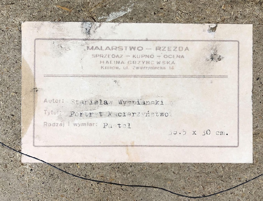 Rzeczywiście, muszę się absolutnie zgodzić, że ta praca ‘would be a great addition to any art collection’. Pastel ten pięknie jest oprawiony, sygnatura duża i czytelna czyli autorstwo absolutnie potwierdzone zaś z tyłu ma równie piękną nalepkę z galerii krakowskiej, firmy Haliny Grzybowskiej, z ulicy Zwerzynieckiej z napisem ‘ Stanislaw Wyspianski’. Pani Halina Grzybowska, jak wiadomo wszystkim kolekcjonerom malarstwa Stanisława Wyspiańskiego, nie uznawała polskich czcionek w maszynie do pisania i stąd Stanisław to Stanislaw a Wyspiański to Wyspianski. Cena wyjścowa w firmie Finger Fake Estate & Auctions bajecznie niska!
