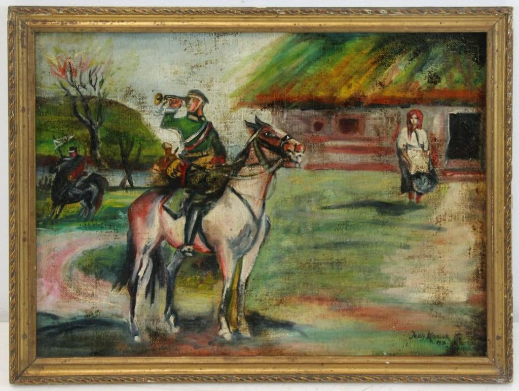 Lot 28. Jerzy Kossak (1886 – 1955). Polish. Oil on Board. Military Scene. 1936. Signed and dated lower right. From a Brooklyn, NY collection. – Dimensions: 12″ high x 16″ wide. Estimate $500 – 700. Starting $250. Clarke Auction Gallery. 02/16/20. Sold $250