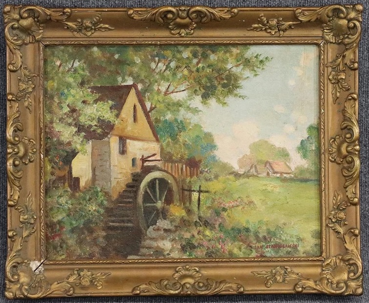 Lot 1191. JOZEF BRANDT Farm Landscape Painting. Man on horseback near well. Signed. Warsaw and Polish language info on reverse. On vintage canvas– Dimensions: Image Size: H: 19.5 inches: W: 23.5 inches. Estimate $300 – 400. Uniques & Antiques Inc. 02/05/20