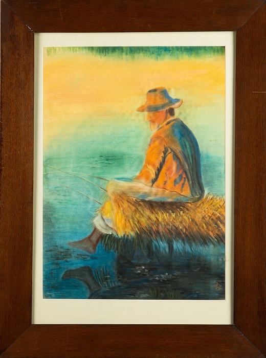 Lot number: 5586581. Leon W., drawing, fisherman, chalk on paper. Polychrome depiction of a fisherman from the side, on a jetty, illegible signature at lower right, 60x42cm (83x62cm). Estimate 2,450 euro. Starting 50 euro. Lauritz. 02/18/20