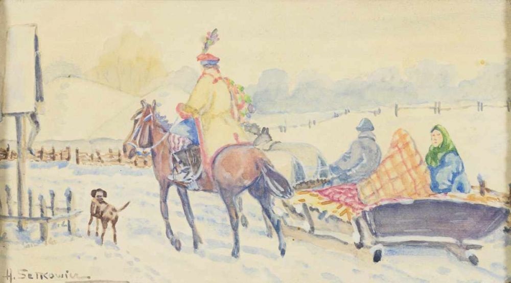 Lot 3267. SETKOWICZ, Adam (1876 Krakau – 1945). Reiter und Schlitten. Aquarell.Polen.Links unten signiert. Bildausschnitt 16 x 29 cm.Gerahmt & hinter Glas: 26 x 39 cm. Bauernschlitten auf verschneiter Straße neben Reiter und Hund. Reserve 180 euro. Wendl. 03/07/20