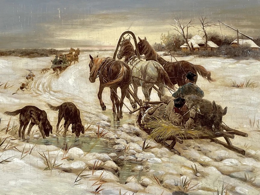 Cenię sobie bradzo twórczość Zygmunta Ajdukiewicza lecz ten olej z aukcji w Bonhams, bardzo ‘monachijski’, nie bardzo. Na pewno ktoś się znajdzie kto go kupi a potem sprzeda w Polsce. Obraz jest bardzo ‘wieruszowsko-kowalski’ lecz brakuje mu rzetelnego wykończenia. Nie podobają mi sie dwa psy niemal stojące przy rozpędzonych saniach – czegmu się one tam przypatrują? Nie podoba mi się wiszący w powietrzu koń ciągnący sanie, którego ani jedno kopyto nie jest zanurzone w śniegu. Podobne jest z psami śmigającymi w powietrzu (latające psy). Twarz woźnicy, siedzącego w saniach, jest niestarannie namalowana a to jest przecież pierwszoplanowa postać. Zad konia był początkowo bardzo okrągły i artysta niestaraniie przykrył jego fragment białą farbą, przez który nadal zad prześwituje. Jest wiele zatem szczegółów świadczących o ‘odpierniczeniu’ tej pracy przez Zygmunta Ajdukiewicza i czyżby braku jego znajomości z pracami Brandta, Szernera, Wieusza, a nawet miniatur Szykiera. W sumie, gdyby nie dobra sygnatura to pomyślałbym, że tę pracę malował ktoś inny (i może tak było!), choć nie mam na to dowodów. Praca ta jest słaba ale jak się ją dobrze podrasuje reklamą w polskiej prasie (tak jak Rubensa) to da się z niej jeszcze wyciągnąć jakieś spore pieniądze- mamy od tego najlepszych specjalistów.