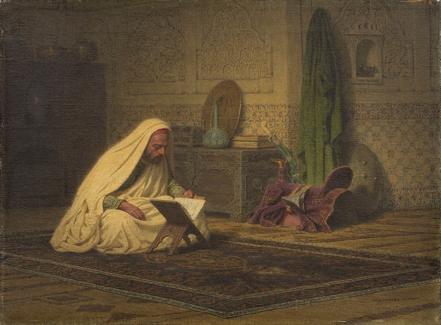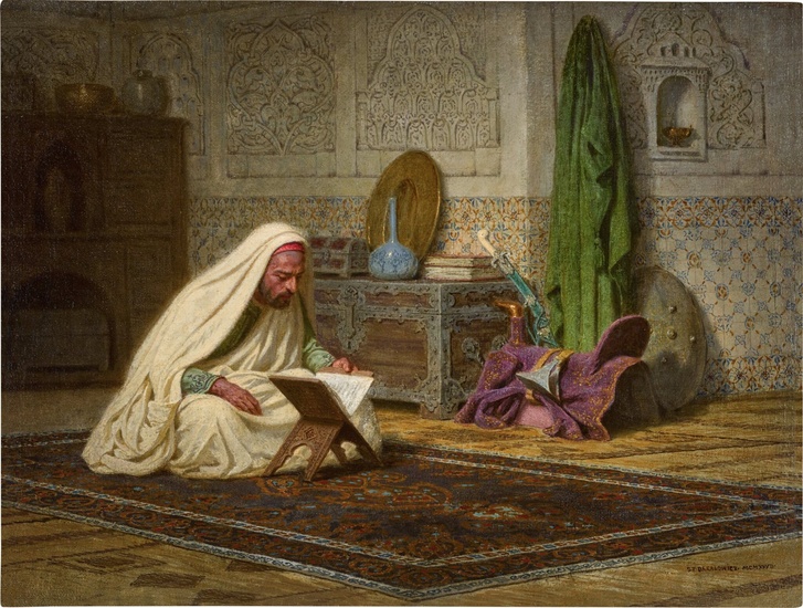 Lot 397. Stefan Bakalowicz (Varsavia, 1857 – Roma, 1947). Lettura araba, 1927 . Olio su tela, cm. 37,5×51. Firma e data in basso a destra: St. Bakalowicz MCMXXVII. Estimate 5,000 – 7,000 euro. Farsettiarte. 04/22/23.