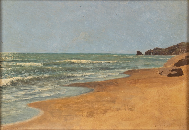 Lot 194. Stefan Bakalowicz. Sunny beach, oil on wood, 27 x 38.5 cm, signed lower right: ST. BAKALOWICZ, on the back, ancient writing with reference to the provenance (Giuseppina Bakalowicz) and reference number: Nr. 76. Estimate 500 – 700 euro. Finarte. 09/25/24. Sold 2,000 euro