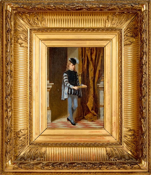 Lot 29. Ladislas BAKALOWICZ (1833-1903). Young Servant with Ewer. Oil on panel signed and located Paris lower right, 18.5 x 13 cm. Estimate 800 – 1,200 euro. Euvrard & Fabre. 03/18/25. Sold 1,700 euro