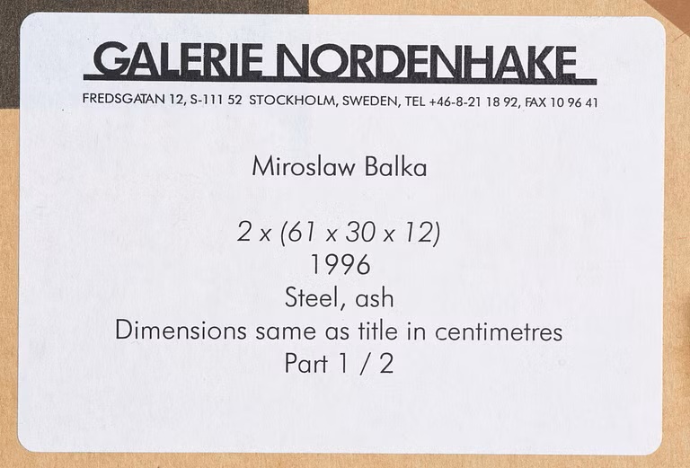 Lot 382. Miroslaw Balka (Poland, Born 1958). “2 x (61 x 30 x 12)“. Executed in 1996. Unique. Diptych. Steel and ash, 61 x 30 x 12 cm per part. Provenance: Galerie Nordenhake, Stockholm. Acquired from the above in 2000 by the present owner. Estimate 60,000 – 80,000 SEK (5,580 – 7,440 EUR). Bukowskis. 10/22/25. Sold SEK 70,000