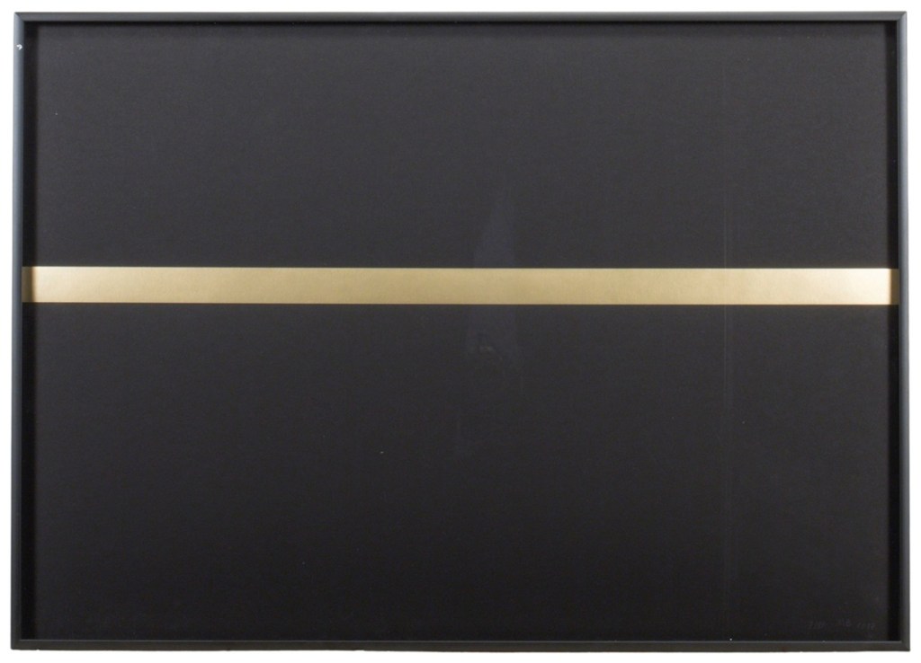 Lot 43. Miroslaw Balka (1958). “Holding the Horizon“, 2017; 47×67.5 cm; hot stamping in matt gold on black colored paper, e.g. 7/80, initialed and dated lower right, within a frame Provenance: Pirelli Hangar Bicocca, Milan. Estimate €500 – 700. Colasanti, Roma. 11/12/25