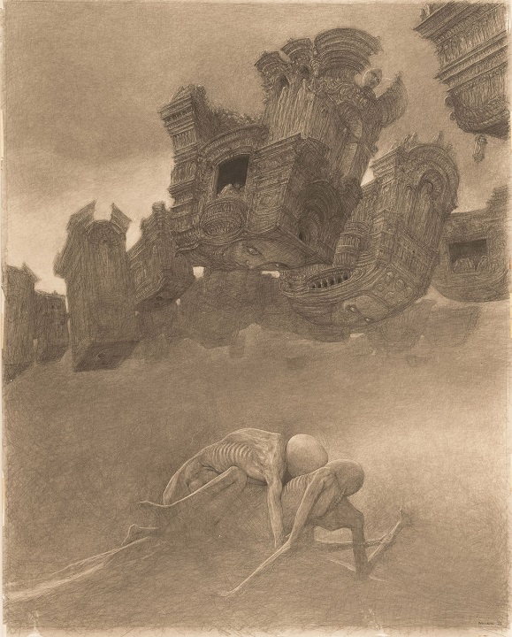 Lot 117. Zdzislaw Beksinski (1929 Sanok, Poland – 2005 Warsaw). Untitled, lead, graphite and charcoal on thin cardboard, 79.5 cm x 62 cm sheet dimensions, signed, dated 74, mounting residue, partial superficial loss of paper, minimal foxing, slightly darkened, partial slight superficial scratches, slightly stained on the verso. Estimate 35,000 euro. Wettmann. 12/02/23. Sold 25,000 euro