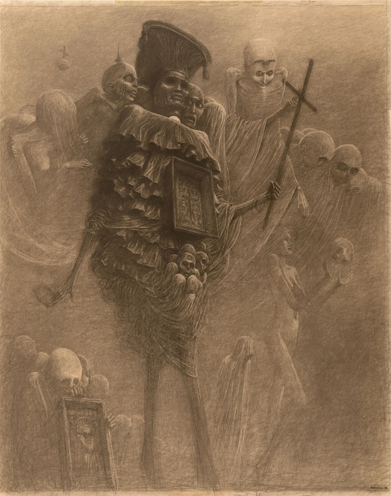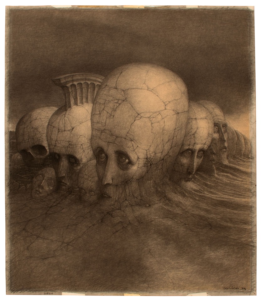 Lot 118. Zdzislaw Beksinski (1929 Sanok, Poland – 2005 Warsaw). Untitled, pencil and black chalk on thin cardboard, 78,5 cm x 63 cm sheet dimension, signed, 73 dated, mounting residues, partial superficial paper loss, minimal stain spotted, slightly darkened. Estimate 28,000 euro. Wettmann. 05/27/23. Sold 28,000 euro