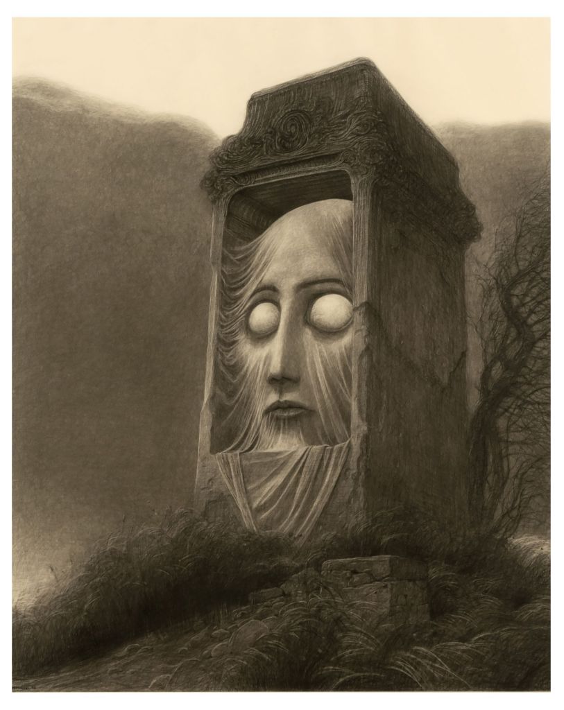 In a barren, stony landscape, the procession of griffin-like mythical creatures, resembling the thestrals, pass by. From the depths of the left-hand side of the picture they pass the viewer and stride towards the right side of the picture, slightly up the mountain. In order to be able to create the depth of the sheet he staggered not only the animals walking one after the other, but also the the gravestones or memorial stones they carry on their backs. Like a spectator we stand before this reverent scene and ask ourselves what the stones mean. For whom were they cut? What is written on them? Where are these beings going to? A silence of mourning can be sensed in the atmosphere of the sheet and leaves the viewer with questions, as so often in the untitled works of Beksinki’s untitled works.