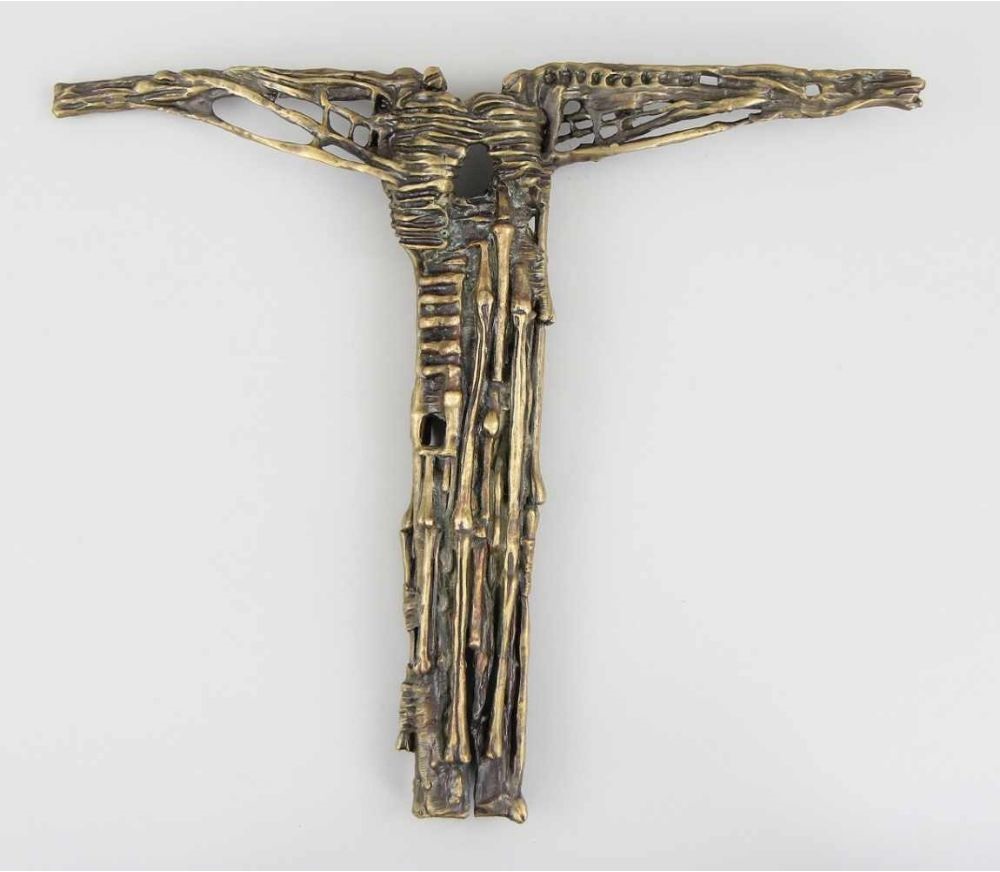 Lot 51248. Beksiński, Zdzisław (Sanok 1929 – 2005 Warschau). Skulptur “Crucification 5/69“, Bronze gegossen und patiniert, Holz, surreales, aus Skelettteilen gebildetes Kreuz, rückseitig signiert, monogrammiert und datiert “BEKSINSKI ZB 5/69”, auf dem Querholm nummeriert “32”, 34,5 x 40,5 cm, wohl original auf Holz montiert, 48 x 37 cm, 1969, später zaponiert 2801 Ab den späten 1960er Jahren spielen Skelette und Kreuzformen eine zentrale Rolle im malerischen Werk des Künstlers, Skulpturen von seiner Hand sind sehr selten, die vorliegende “Crucification” findet in den 1980er Jahren im malerischen Werk eine deutlich auf dieser Skulptur basierende Wiederholung, vgl.: Natalia P. Koptseva und Ksenia V. Reznikova 2015, Three paintings by Zdzisław Beksiński: making art possible “After Auschwitz”, Journal of Siberian Federal University. Humanities & Social Sciences 5, Seite 879 – 900, Nr. 4 (Seite 885 – 888, https://pdfs.semanticscholar.org/d564/2f196ac46b44b1dfb0ed04b016fb0f574cee.pdf). Reserve 2,500. Auktionshaus Owl. 10/31/20