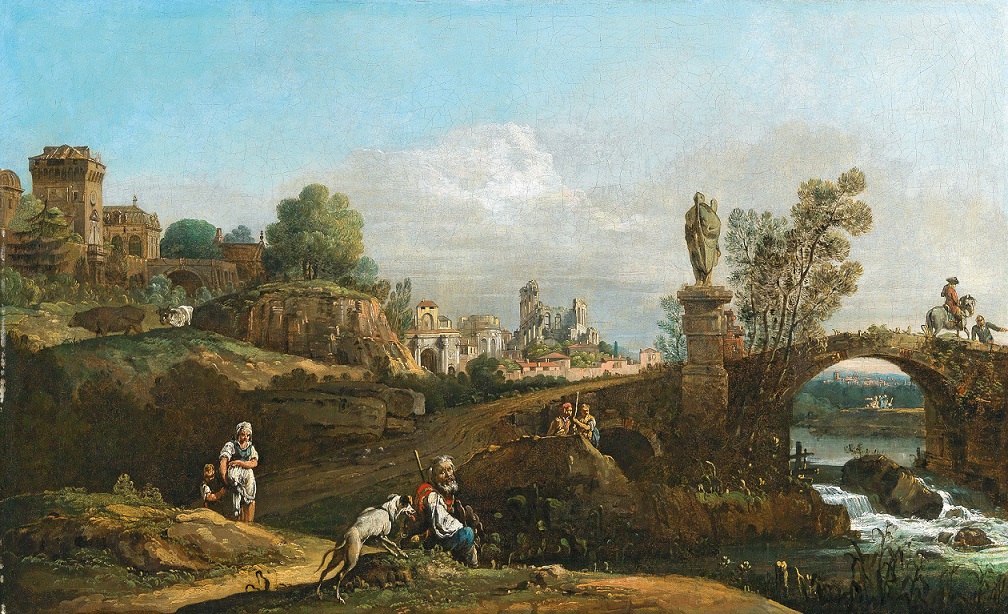 In the foreground a path cuts through the scene diagonally, leading to a bridge on the right. Under the arch of the bridge, another city is visible in the distance. The statue on a pedestal to the left hand side of the bridge is reminiscent of the same subject depicted by Bellotto in his earlier painting of the Karlskirche in Vienna (see Kozakiewicz 1972, vol. II, p. 200, no. 257). In the present painting the scene is animated by a number of country-folk, including a man in the foreground seated with his dog; this bearded figure is shown in different poses in other compositions by the artist, including the Imaginary view with Bellotto’s self-portrait in the National Museum, Warsaw.
