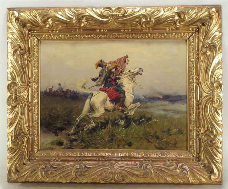 Item No. 3356249. Josef von Brandt, Polish, 1841-1915, Cossack Trumpeter Sounding a Charge, oil on canvas, signed and inscribed lower right. Very faintly inscribed on canvas verso. Fragments of an old paper label. 17 1/2 x 23, framed 28 x 34. Original canvas, light vertical stretcher marks visible in raking light, no inpainting visible under blacklight, canvas slightly rippled and needs rekeying; toned varnish, most visible in the sky. Provenance: Purchased by William Brewster of the Brewster Carriage Company, 1866-1949, in Paris circa 1890 and passed down to his granddaughter Marie. Estimate $30000-50000.