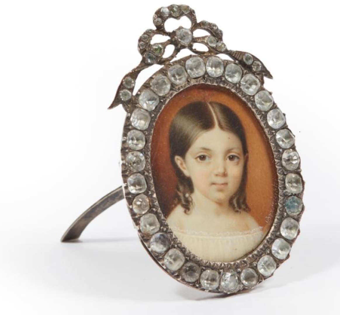 Miniature sur ivoirede forme ovale, signée en bas à droite, conservée sous verre bombé dans un encadrement en tissu (rapporté), avec pied chevalet au dos. Bon état.