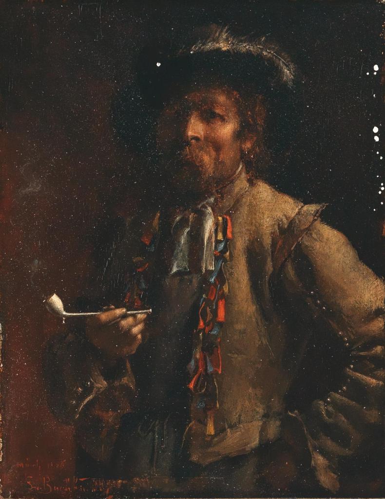 Lot 875. Buchbinder, Simeon (Szymon) (1853 Radzyn – 1903 Berlin, Polish genre painter, member of the “Munich School”) – “At the Goldsmith’s,” a historicist interior of a richly furnished goldsmith’s workshop. On the right, the master goldsmith, wearing a leather apron, sits comfortably in an armchair, examining a gold goblet. A leopard skin lies at his feet. His right arm rests bent on a massive table with a green brocade tablecloth, on which sumptuous tableware is displayed. In front of him are an anvil, tongs, and other goldsmith’s tools. Sketches and designs lie on a chair. On the left is the elegantly dressed patron with companions, who look expectantly at the goldsmith. Oil on canvas, relined, signed, dated, and inscribed “S. Buchbinder Krakow 1882” lower left. Approx. 86 x 130 cm. Some paint loss and scratches. Unframed. Opening €4,800. Blank Auktionshaus. 11/29/26. Sold €45,500