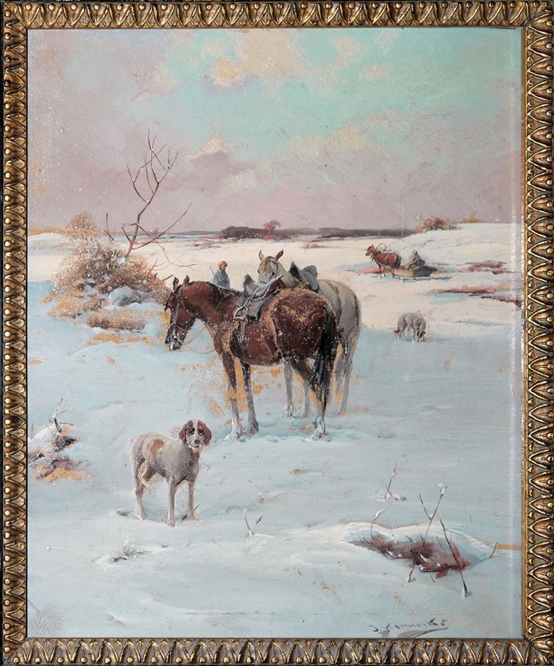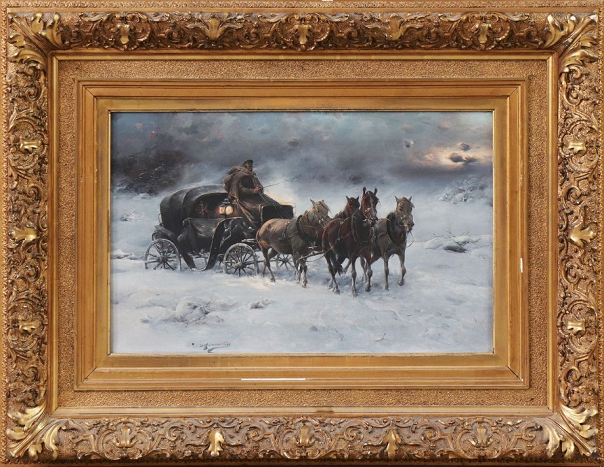 Lot 1083. Oil on Polish panel “Sleigh“, signed lower left J. KONARSKI (Jan, 1850-1918). Origin: Poland, Period: 19th century. Materials: Oil on panel. Dimensions: Ht 18 x 27 cm. Frame dimensions: Ht 38 x 47 cm. Estimate $6,000 – 7,000. Montana Antiques. 01/28/24. Passed