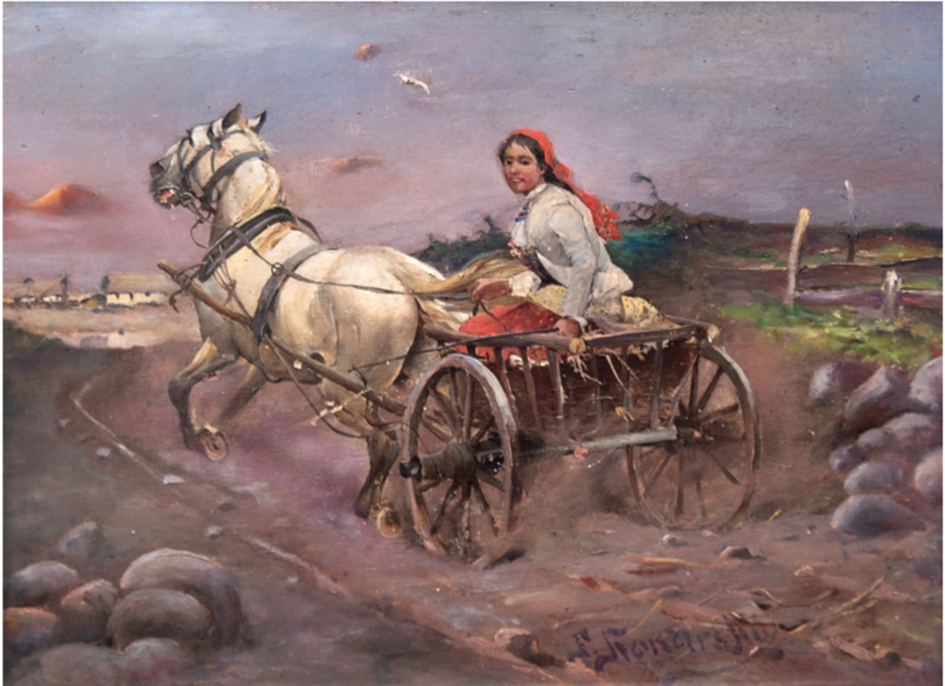 Lot 135. Konarski, Josef (1849-1915), eigentlich Alfred von Wierusz-Kowalski) “Junge Bäuerin auf Pferdegespann), Öl/H., sign. u.r., 16,5 x 22,5 cm, Rahmen. Starting 900 euro. Satow. 07/30/22