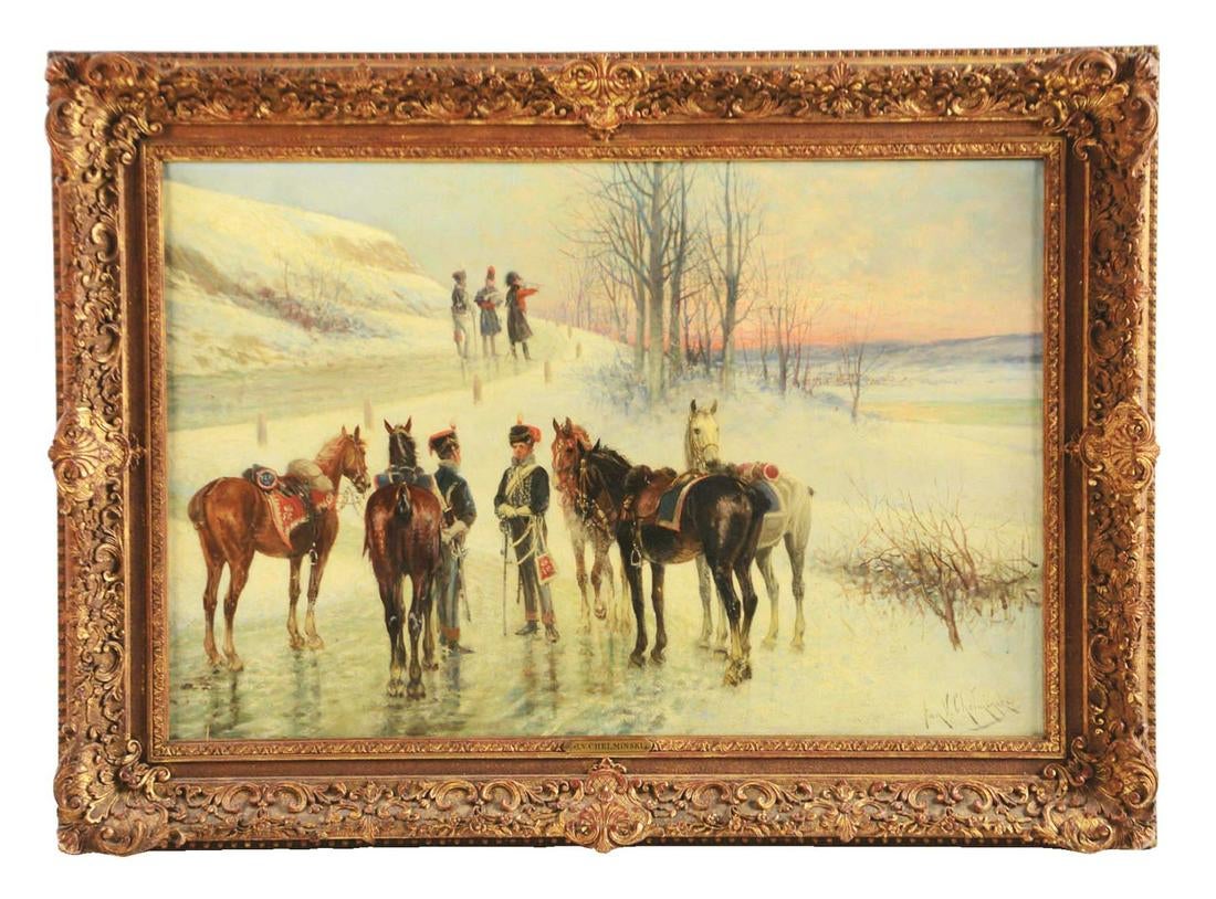 Lot 1083. JAN VAN CHELMINSKI (POLISH, 1851 – 1925). Site measures 20″ x 30″. Overall 27″ x 37″. Painting titled on lower right verso in hand of artist, Jan Van Chelminski. This oil on canvas depicts a winter scene of four dismounted soldiers in uniform with their horses and another soldier. CONDITION: Very good restored condition, with one small vertical tear of about 1-1/2″ along the front right leg of the horse on the far left. This is nearly invisible and could be easily repaired at very little cost. No other evidence of damage, repairs, or inpainting are visible under a blacklight. PROVENANCE: Schwartz Galleries, 517 Madison Ave., New York, New York, and a New Jersey private collection. A very attractive piece. Estimate $2,500 -4,500. Dan Morphy Auctions. 05/18/21