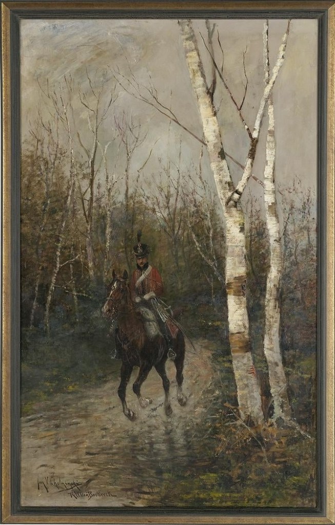 Jan Chełmiński.Prussian Cavalry Soldier on Horseback in the Woods