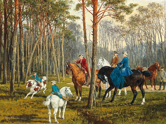 Scena z życia wysokich sfer sprzed 300 lat mająca prawie nic wspólnego z teraźniejszością i nic nie wnosząca do teraźniejszości. Dlatego oceniam pracę za słabą mimo niewątpliwie bardzo dobrego warsztatu malarskiego. Las sosnowy jest piękny, drzewa wysokie, konie równie wysokie i piękne i nie są to perszerony, osoby na wycieczce w lesie ślicznie ubrane, dzieci na kucykach bawią się znakomicie. Bardzo czysta scena w ciepły dzień uchwycona i to tyle. Jakie jest przesłanie tej pracy? Co jest w niej ważnego? Czy jest w niej coś co przyciągnie ludzi na ewentualną wystawę? Jan Chełmiński to dla mnie artysta, który mógł malować znaczące sceny nawiązujące do historii polskiej a wybrał, w wielu przypadakach, puste w przesłaniu obrazki.