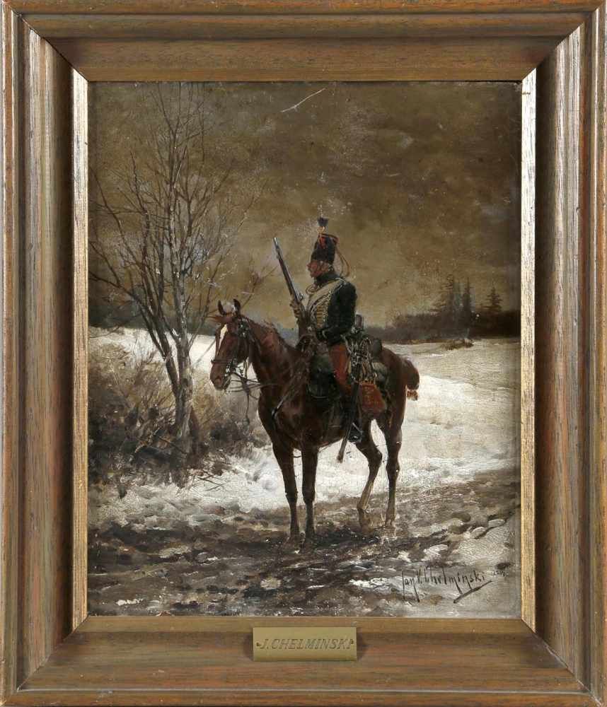 Lot 302. JAN VAN CHELMINSKI (1851-1925). Cavalry officers in the snow by a signpost at sunset, signed, oil on panel, 21.5 x 26.5cm. estimate 2,000 GBP – 3,000 GBP. Mallams Ltd. – Oxford. 02/26/20. Sold 2,200 GBP