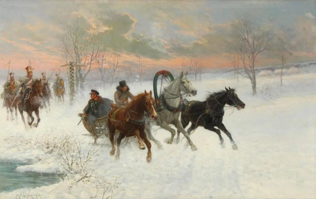 Jan Chełmiński. A winter village street scene with Hussars departing for war