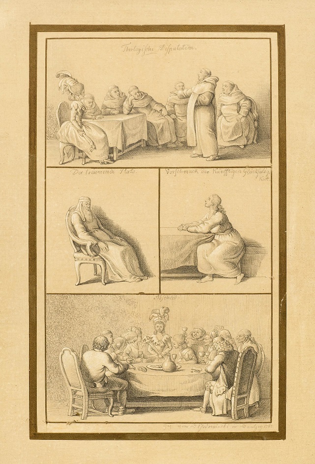 Cztery rysunki Daniela Chodowieckiego na jednej kartce papieru z kluczową (ewentualnie pierwszą) sceną dyskusji teologicznej grupy mnichów. Prac Chodowieckiego jest sporo na rynku choć dominują różnego rodzaju sztychy. W tym przypadku mamy odręczne rysunki, wykonane w dodatku w Gdańsku w 1780 roku.